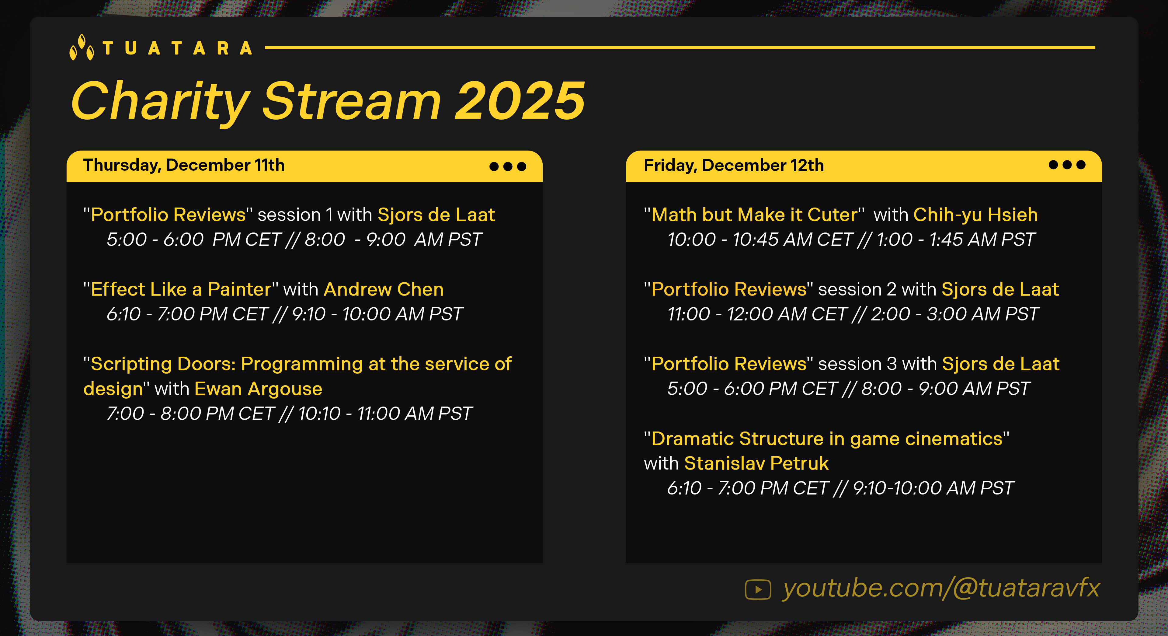 After raising over $12,000 for Child’s Play in previous events, we’re excited to come together again to share, and give back to the realtime visual effects and gamedev scene.